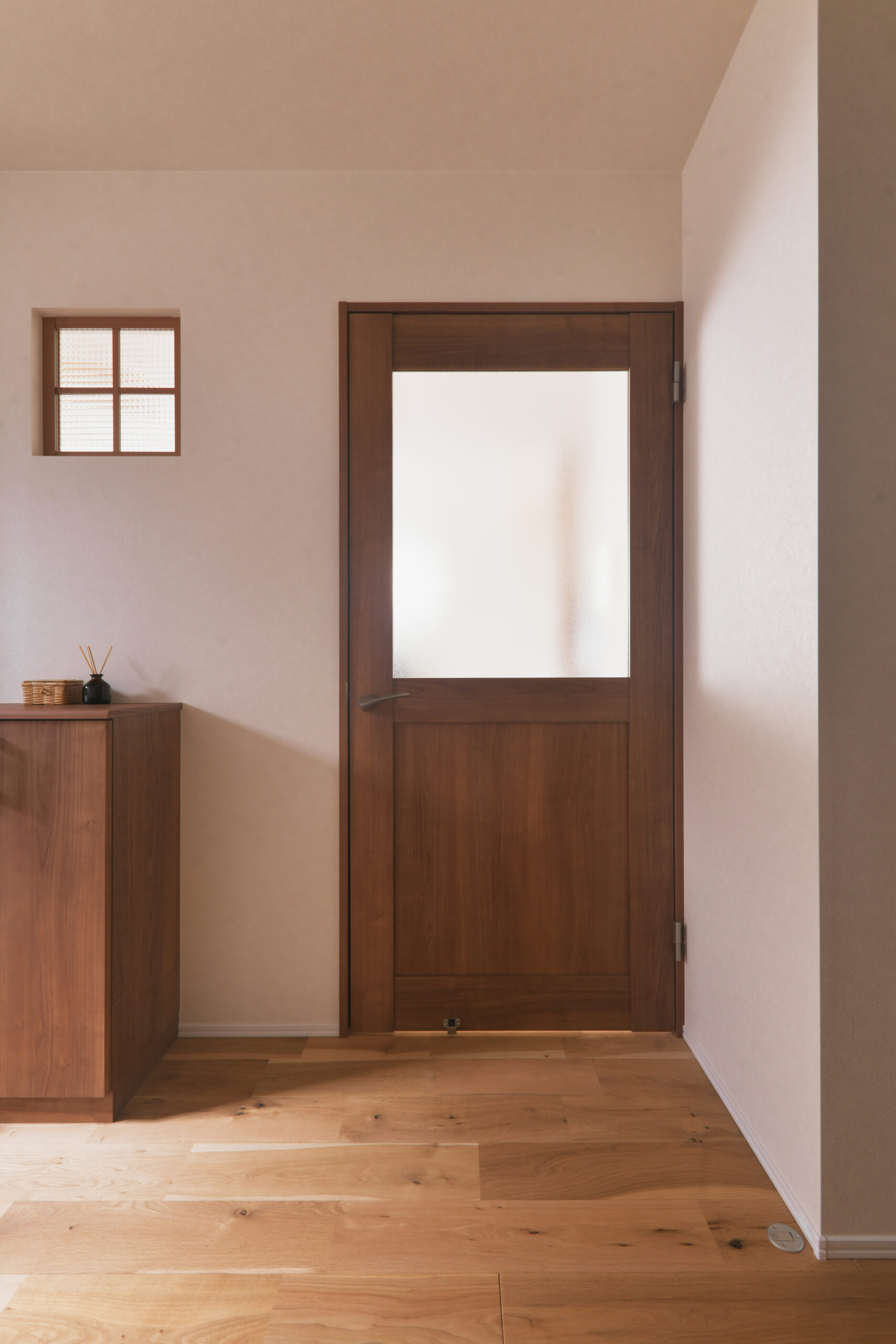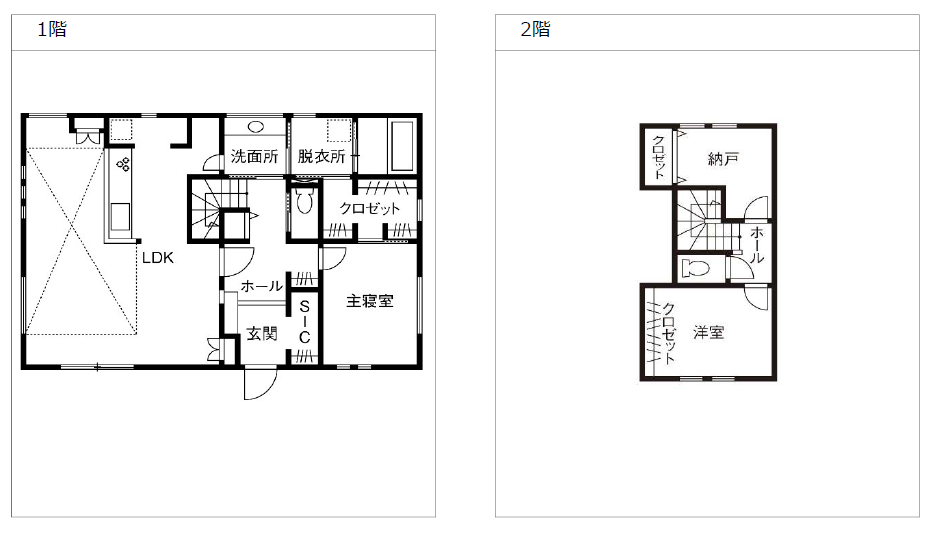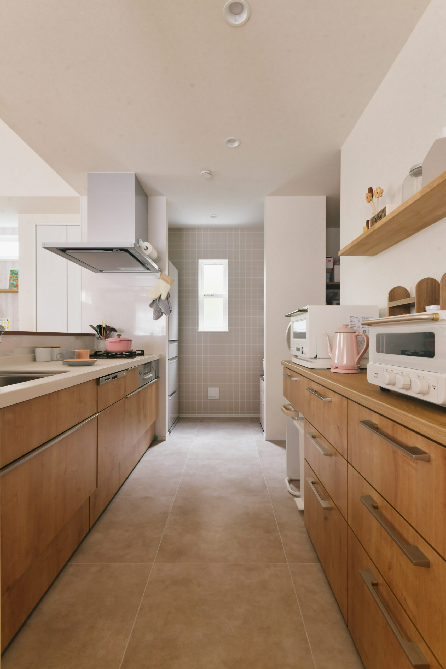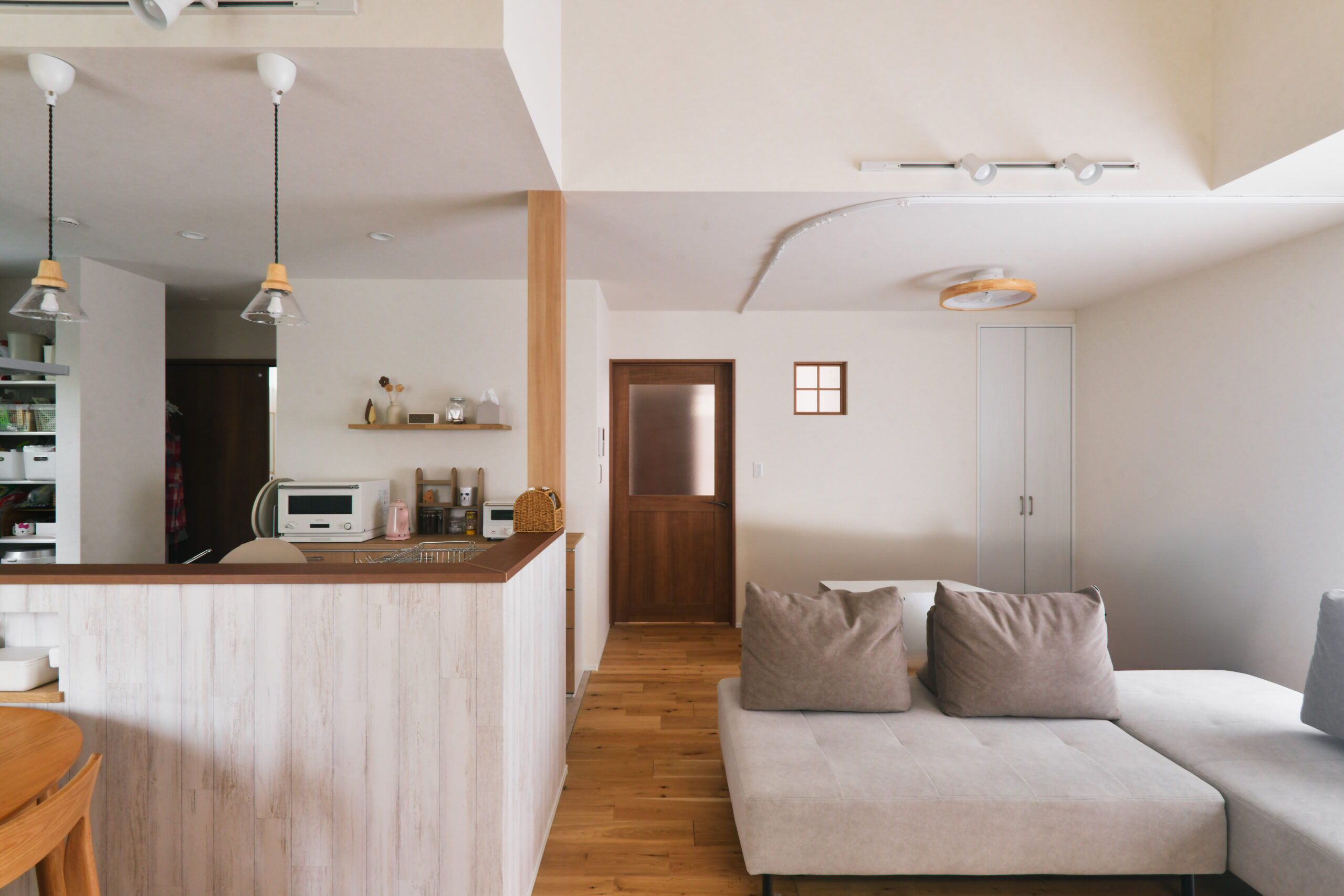 住まい。特筆したいのは、カリフォルニアの風を感じさせる洗練された外観だ。夫人の希望で実現したデザインだが、Oさんも実際の仕上がりにとても満足しているそう。間取りは、1階に寝室と大きなクローゼットを配置し、ワンフロアで暮らしが完結できるよう設計。キッチン・洗面所・脱衣所・クローゼット・寝室へとつながる回遊動線を採用し、動きやすさを日々実感しているという。そして、当初からこだわっていた無垢床には、楢の幅広タイプを選択。玄関からリビングまで、木のぬくもりがやさしくつながり、空間全体に自然な一体感が生まれている。「私たちの要望は多かったと思いますが、“無理”だと一蹴するのではなく、“こうすればできるかも