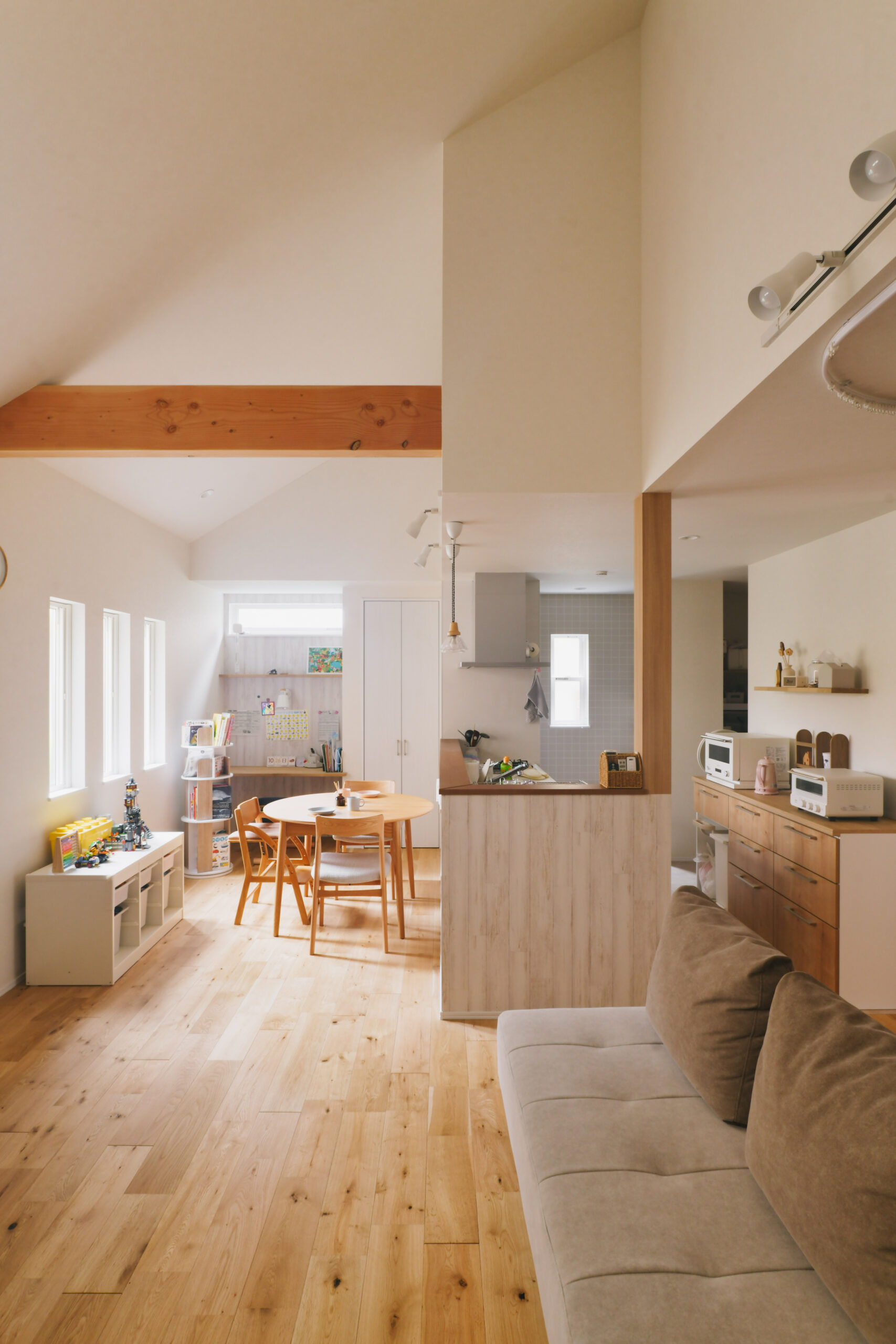 「家は無垢床にしたいと思っていて、Webで検索した際にライクスホームさんのホームページを見つけたんで す」そう語るのはOさんご夫妻。家を建てると決めてから、様々な会社の住まいを見学する中で、改めて木や自 然素材の心地よさに惹かれていったそうだ。同社を選んだ理由は、自然素材を活かした住宅の実績が豊富で、どの住まいにも惹かれる魅力があったから。そんなOさんが作り上げたのは、美しさと暮らしやすさを兼ね備えた
